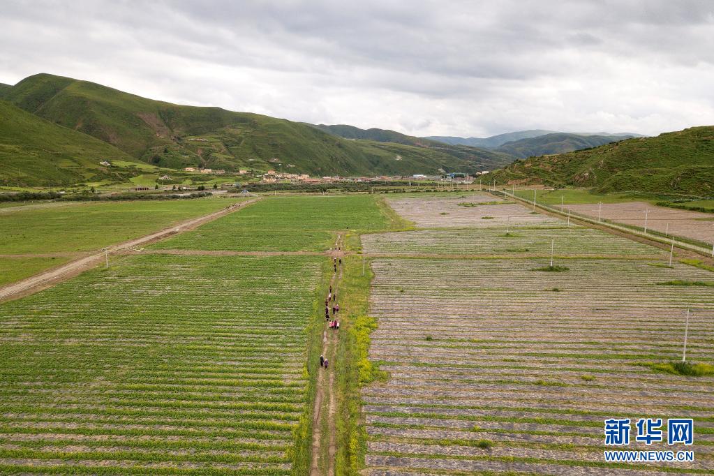 7月17日,壤塘縣瑟谷村農(nóng)牧民進入蔬菜基地勞作(無人機照片)。新華社記者 李鑫 攝