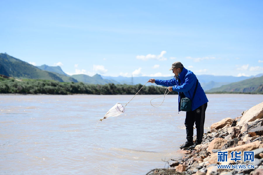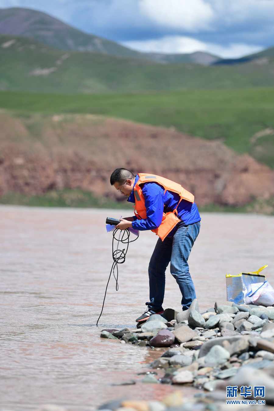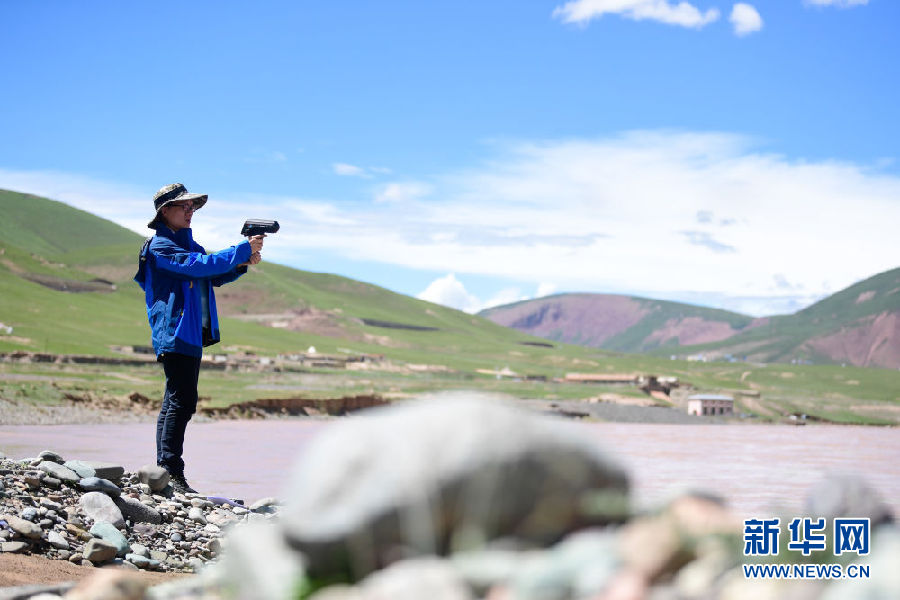 2021年長江源綜合科考的科考隊(duì)員陳鵬在通天河流域觀測(cè)河流流速(7月24日攝)。新華社記者 張龍 攝