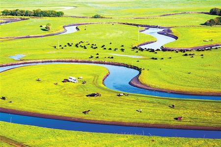 黃河首曲,綠毯似的草地延伸向遠(yuǎn)方,黃河支流似飄帶般蜿蜒其間……