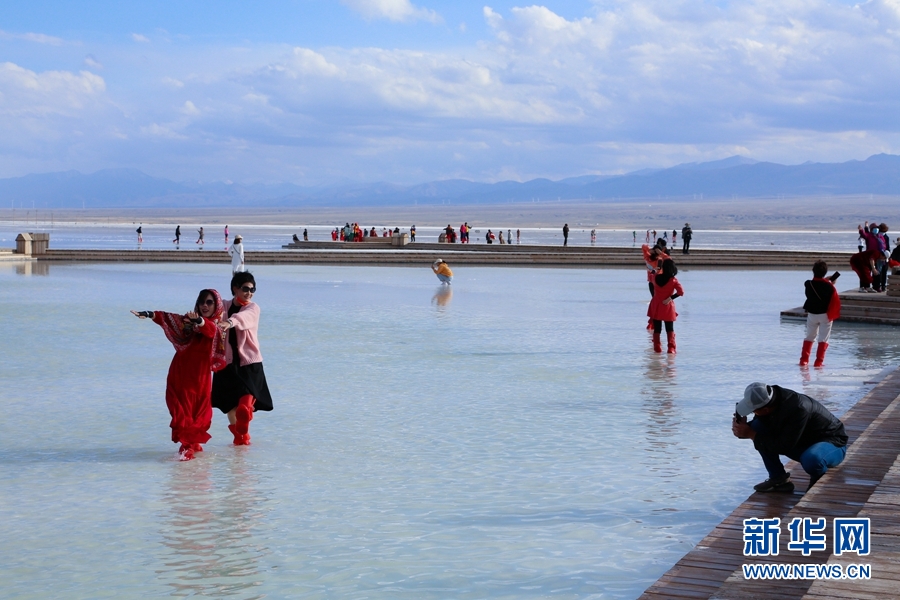 游客在茶卡鹽湖“天空之鏡”景區(qū)游玩。新華網(wǎng) 卡婭梅朵 攝