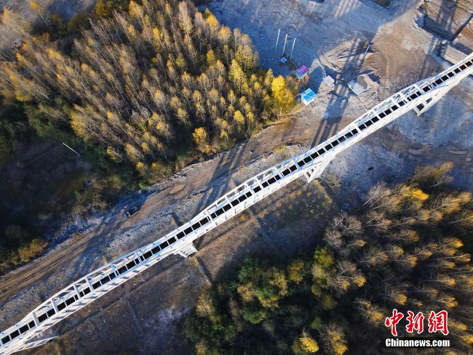 10月16日,航拍青海省海南藏族自治州貴德縣拉西瓦灌溉工程中建設(shè)的渡槽。(無人機照片) 中新社記者 馬銘言 攝