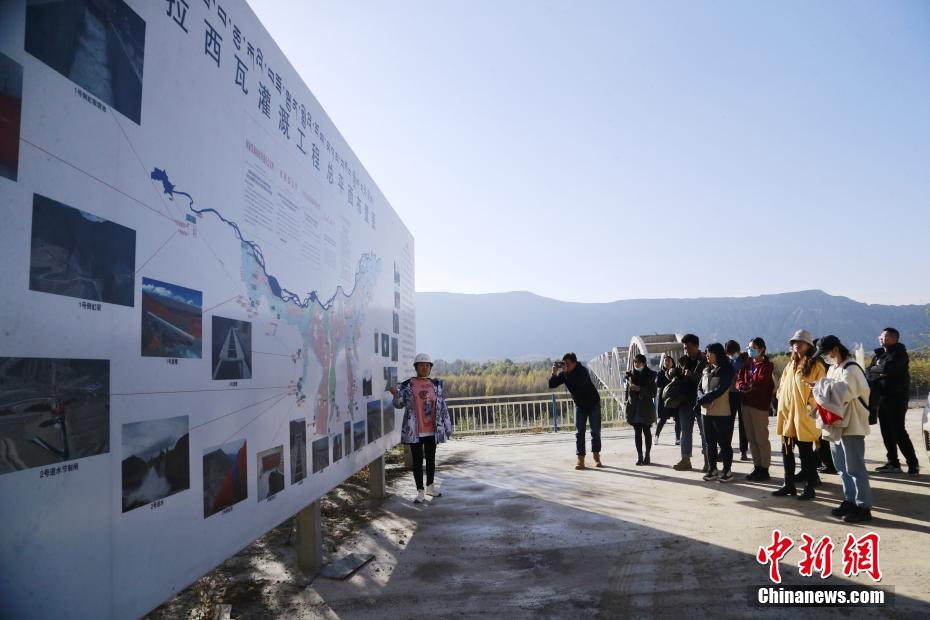 10月16日,青海省海南藏族自治州貴德縣拉西瓦灌溉工程建設(shè)點,工作人員向記者介紹該工程項目進展。中新社記者 馬銘言 攝