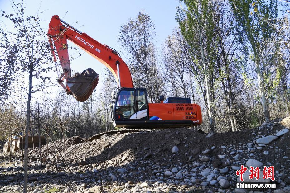 10月16日,青海省海南藏族自治州貴德縣拉西瓦灌溉工程中的一處建設(shè)點,工人用挖掘機施工。中新社記者 馬銘言 攝