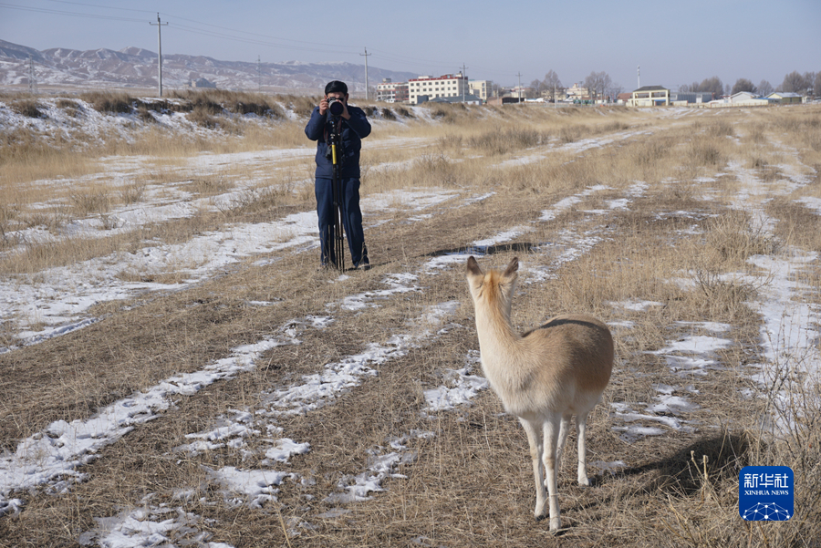 2月11日,吳永林正在和普氏原羚“東東”一起在保護(hù)站內(nèi)巡查。新華社記者 周盛盛 攝