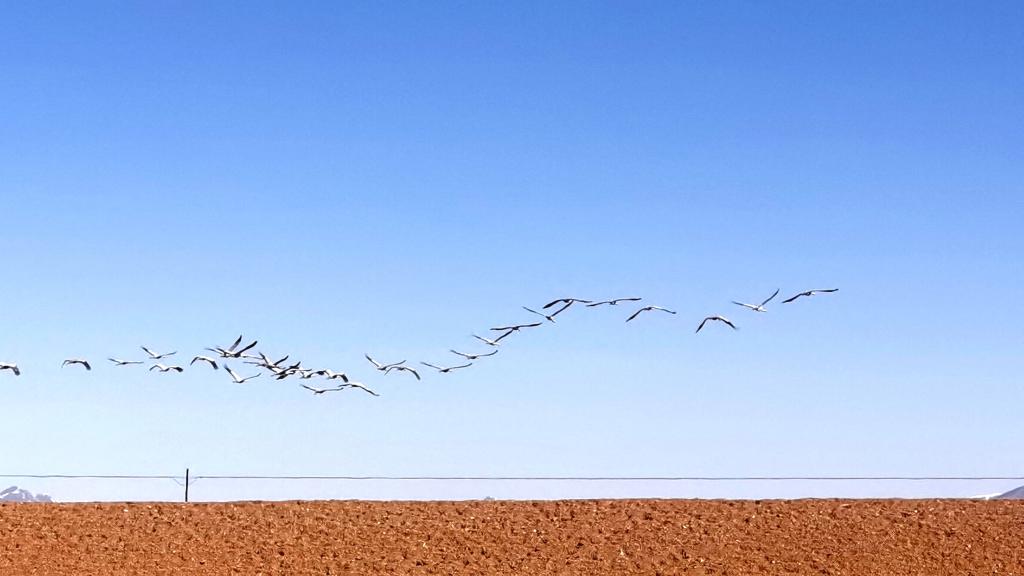 蓑羽鶴生性機(jī)警,記者所乘車輛在約百米遠(yuǎn)處剛停下,成群的蓑羽鶴便展翅高飛,發(fā)出陣陣鳴叫,急急地向東北方向飛去。