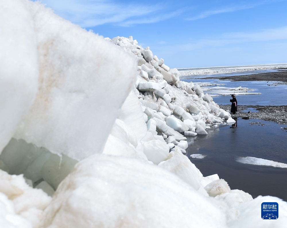 3月19日,在青海湖邊,一位當?shù)啬撩裨谂臄z堆積在岸邊的湖冰。新華社記者 張龍 攝