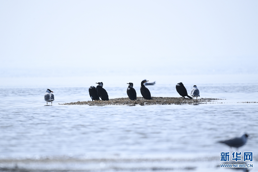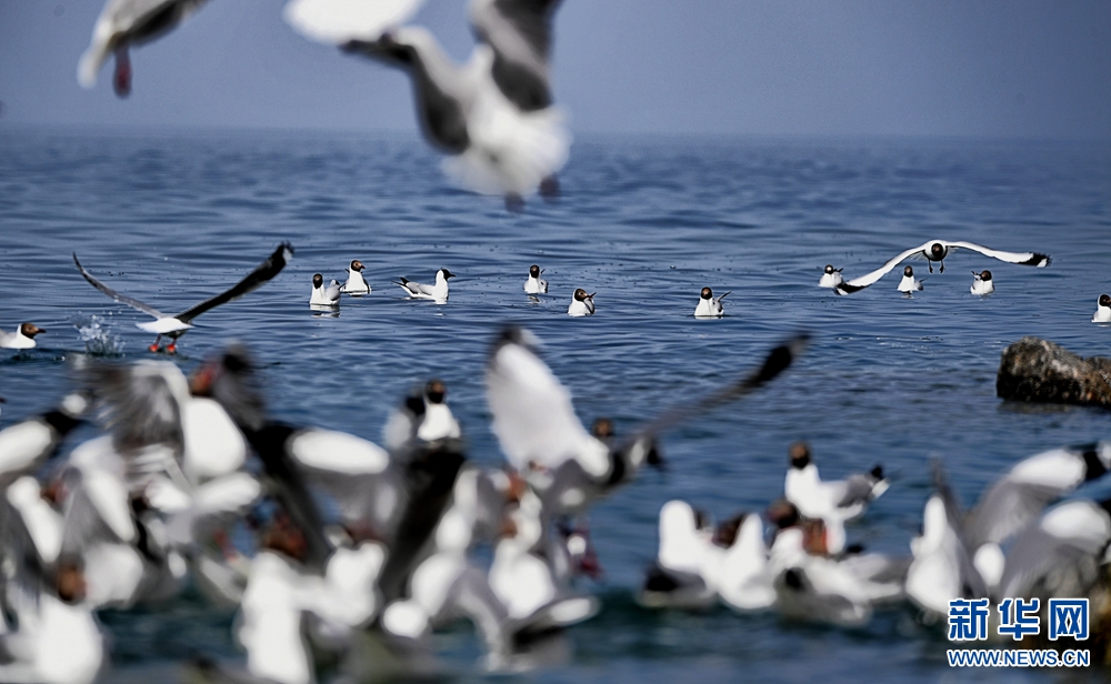 水鳥在青海湖上嬉戲。新華網(wǎng) 潘彬彬 攝
