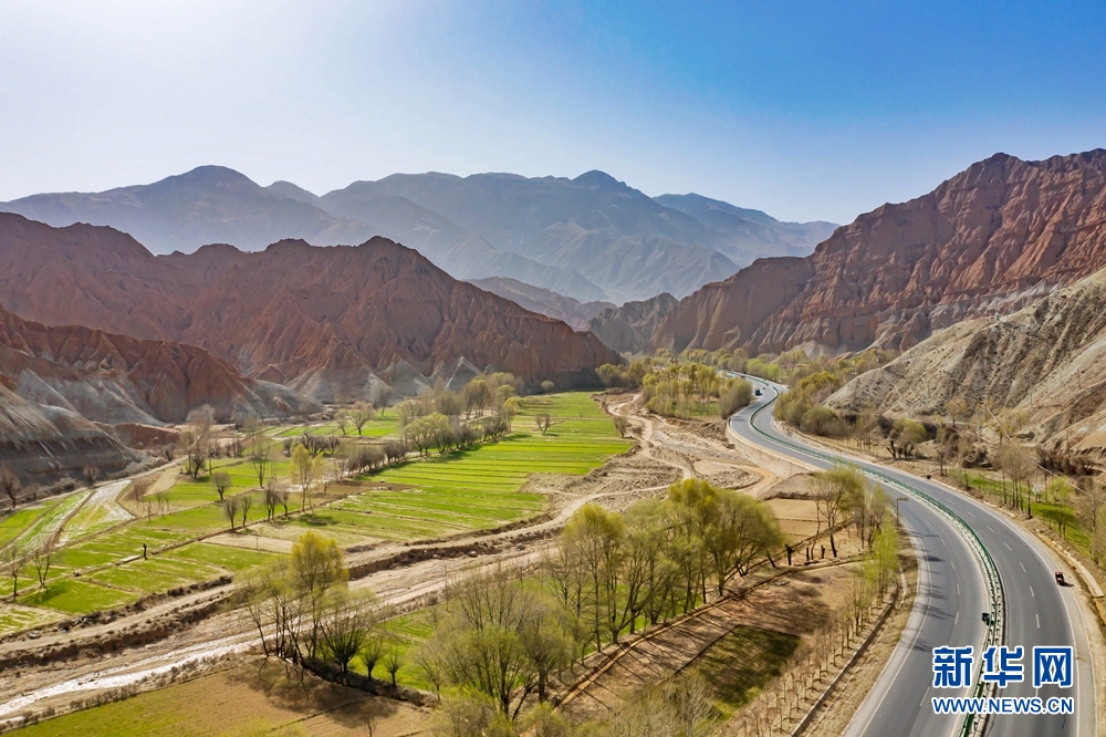 公路蜿蜒在丹霞峽谷中,四周山脈層層疊起,工整而靈動,風景絕美。新華網 宋忠勇 攝