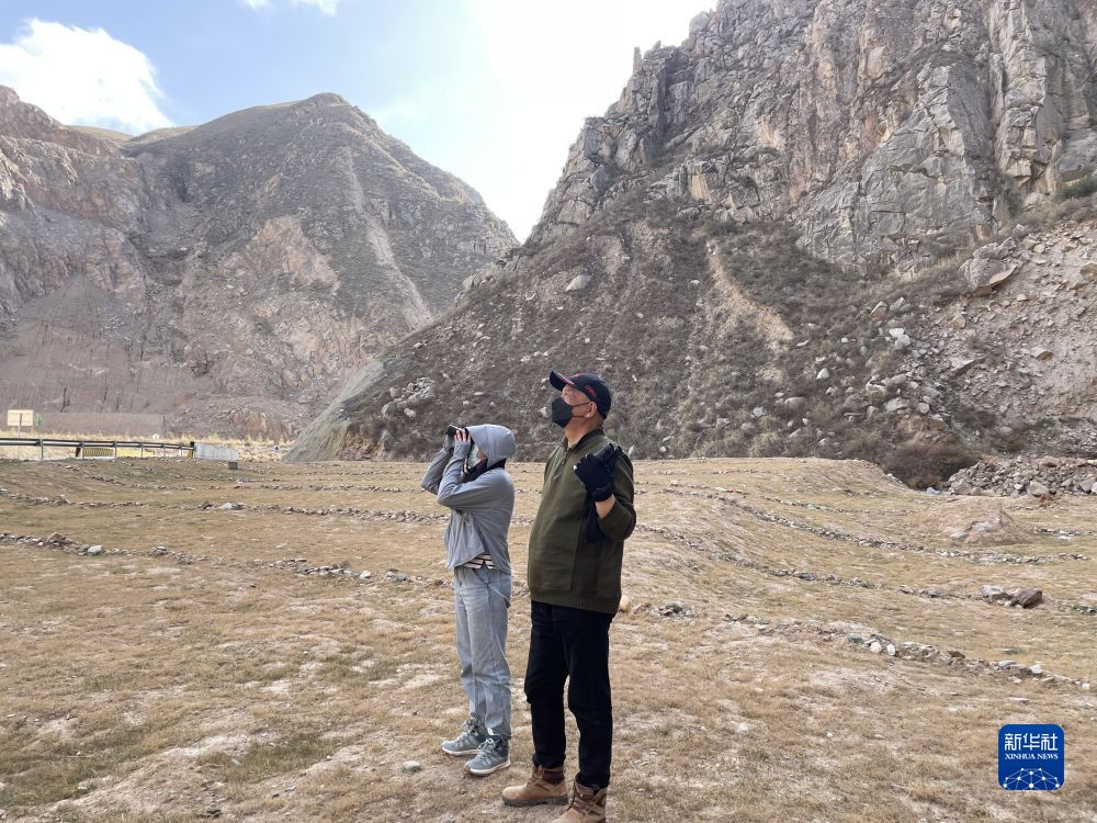 4月9日,在青海省海東市平安區(qū),王艦艇(右)觀察遠處的黑鸛。 新華社記者 耿輝凰 攝