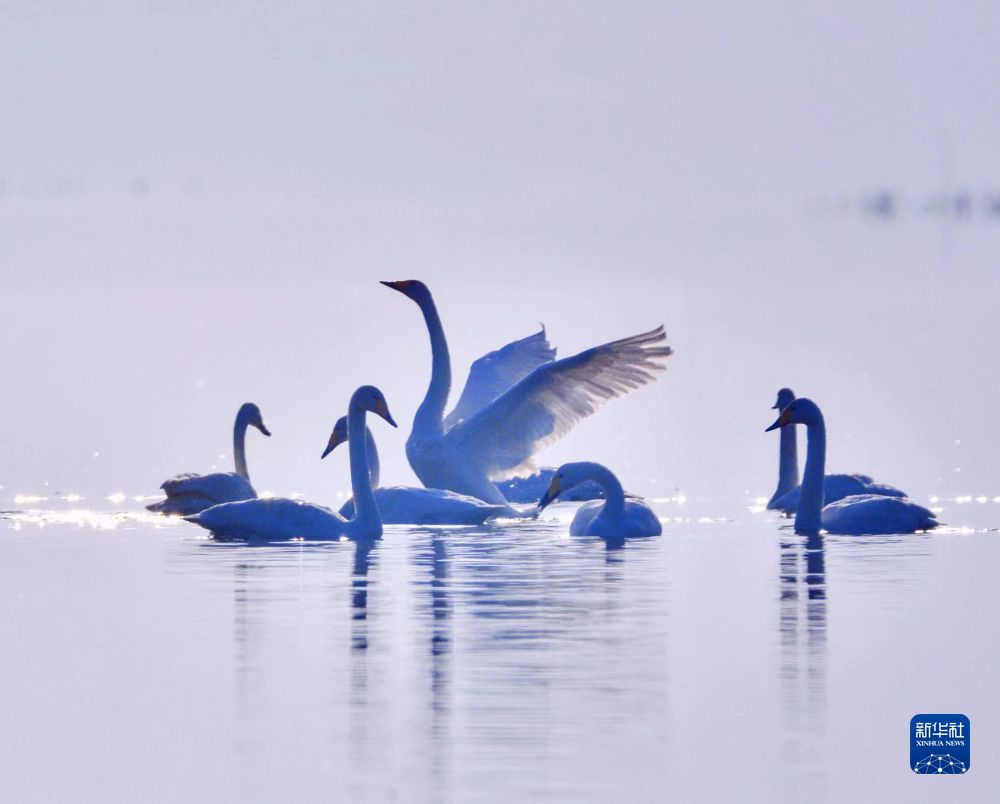 2021年11月23日在青海省海東市化隆回族自治縣境內(nèi)的黃河濕地拍攝的大天鵝。新華社發(fā) 李玉峰 攝