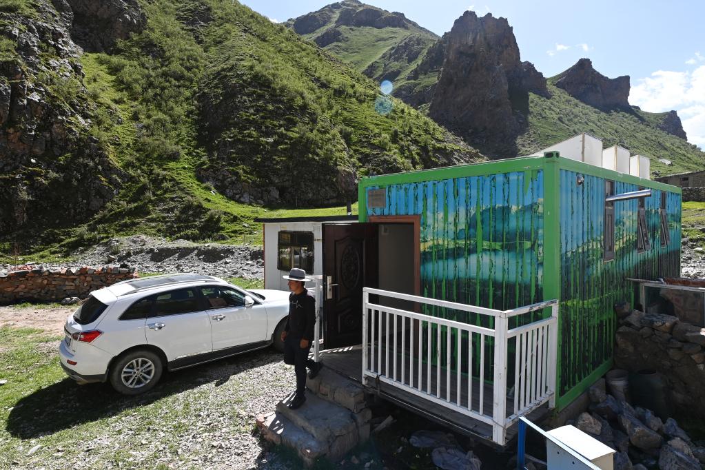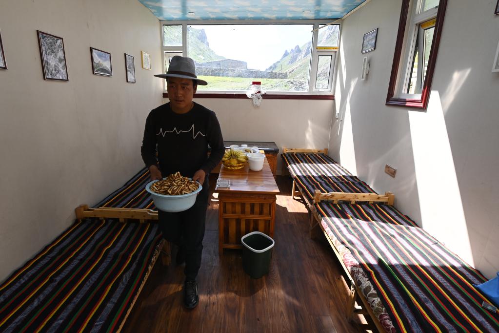 盛夏,昂賽大峽谷流水潺潺、綠草如茵;四周山勢(shì)奇絕,常有雪豹、白唇鹿、巖羊等野生動(dòng)物出沒。在特許經(jīng)營(yíng)接待集裝箱內(nèi),桑周忙著打掃衛(wèi)生,清洗床鋪,準(zhǔn)備迎接從各地到來的自然體驗(yàn)者。