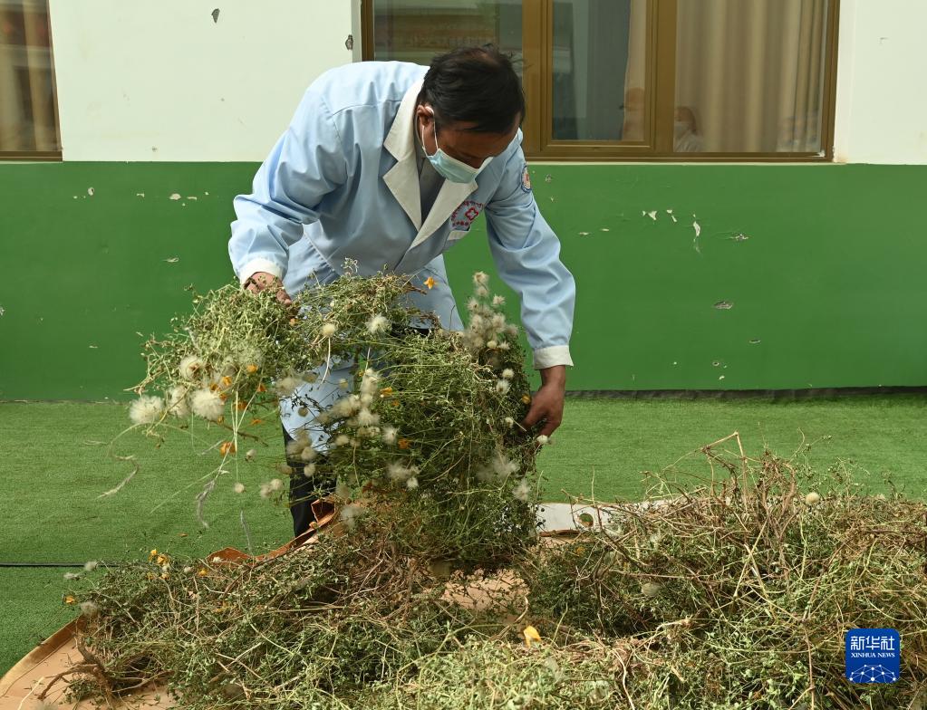在治多縣索加鄉(xiāng)衛(wèi)生院,布久索南更青整理采集晾曬的藥材(8月11日攝)。新華社記者 范培珅 攝