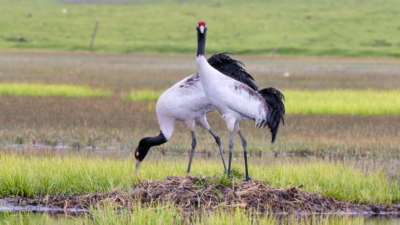 4月中旬,河南蒙古族自治縣生態(tài)環(huán)保志愿者才項(xiàng)南加深入濕地開始監(jiān)測河南縣全域黑頸鶴的動態(tài),棲息在縣城附近的一對黑頸鶴引起他的關(guān)注。于是,才項(xiàng)南加全過程拍攝了黑頸鶴擇偶、恩愛、產(chǎn)卵、孵化、撫育的場景。這對黑頸鶴夫婦經(jīng)過1個多月的溫情守護(hù),迎來了自己的愛情結(jié)晶——一對“鶴寶寶”。在草原最美的季節(jié)里,幼鶴在父母的喂養(yǎng)及陪伴中慢慢成長,一家四口幸福漫步在澤曲河畔。