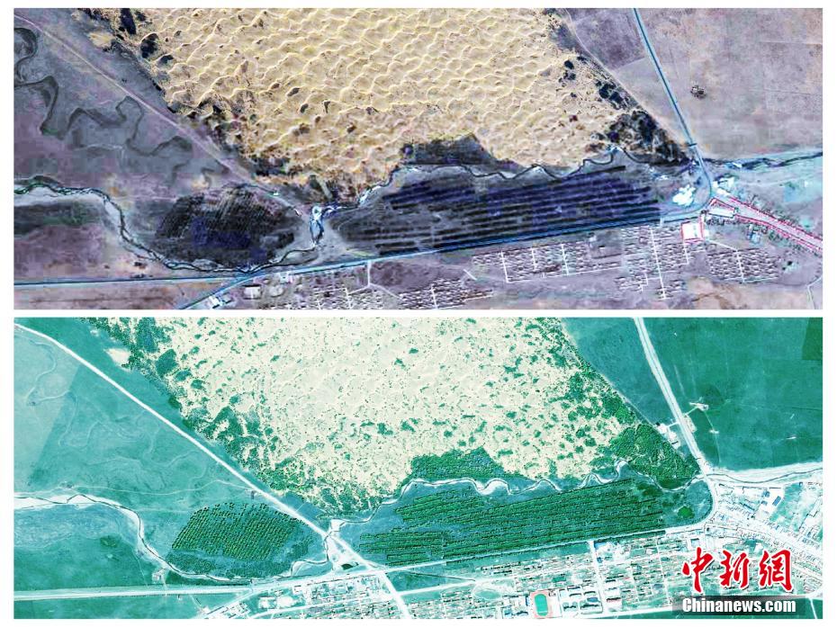 圖為青海省海南州貴南縣黃沙頭2013年(上圖)和2022年(下圖)治理對比。彭璽 供圖