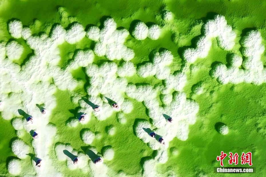 高原深秋,攝影愛好者在素有中國聚寶盆之稱的青海省海西蒙古族藏族自治州,拍攝察爾汗鹽湖的秋日美景。畫面中“萬丈鹽橋”“漂浮”在湖面上,翠綠或是淺綠色的鹵水好似盛在“聚寶盆”里的寶玉,秀色可餐。由于水分不斷蒸發(fā),鹽湖上形成堅(jiān)硬的鹽蓋,青藏鐵路和青藏公路直接修建于鹽蓋之上。察爾汗鹽湖蘊(yùn)藏有豐富的氯化鈉、氯化鉀、氯化鎂等無機(jī)鹽,總儲量達(dá)20多億噸,為中國礦業(yè)基地之一。 包雷 攝