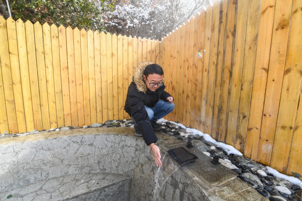 2月9日,鐘毅在小木屋內(nèi)的溫泉浴池旁試水溫。新華社記者 王曦 攝