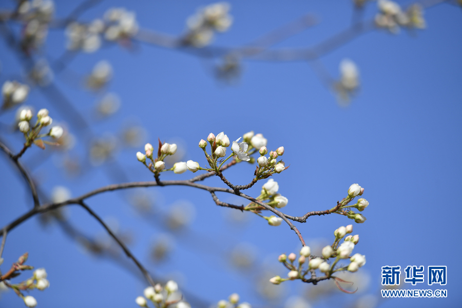 黃河岸畔的梨花迎春綻放。新華網 卡婭梅朵 攝