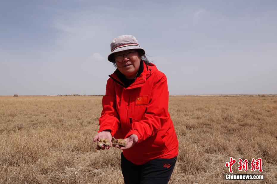 新建觀測站勘查選址過程中,第二次青藏科考中科院空天院分隊領(lǐng)隊賈立研究員展示介紹濕地中凝結(jié)的鹽塊。孫自法 攝
