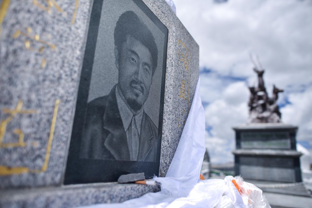 這座石碑鐫刻著杰桑·索南達(dá)杰的名字。20多年前,為了保護(hù)瀕危的藏羚羊,他與盜獵分子槍戰(zhàn)到生命最后一刻,遺體被凍結(jié)成冰雕。