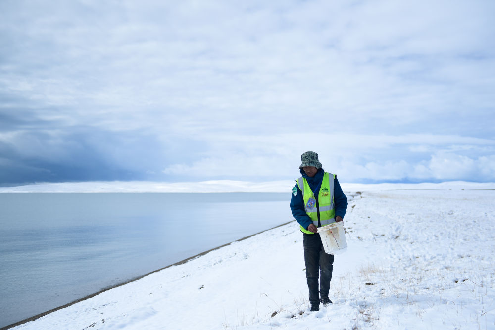 2021年10月20日,在青海省果洛藏族自治州瑪多縣扎陵湖鄉(xiāng)勒那村,三江源國家公園黃河源園區(qū)生態(tài)管護(hù)員在扎陵湖邊撿拾垃圾。新華社記者 張龍 攝