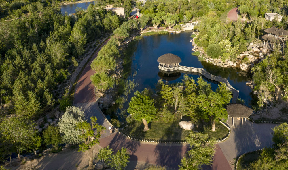 坐落在寧夏銀川市賀蘭山腳下的賀蘭山運(yùn)動休閑公園(2021年5月27日攝,無人機(jī)照片)。這里曾是一片砂石采礦塌陷區(qū),當(dāng)?shù)赝ㄟ^植被景觀再造、水系建設(shè)、現(xiàn)代管網(wǎng)鋪建等手段,重新利用廢石、廢坑及各類廢棄建筑材料,把這里變成一座免費(fèi)開放的主題公園。新華社記者 馮開華 攝