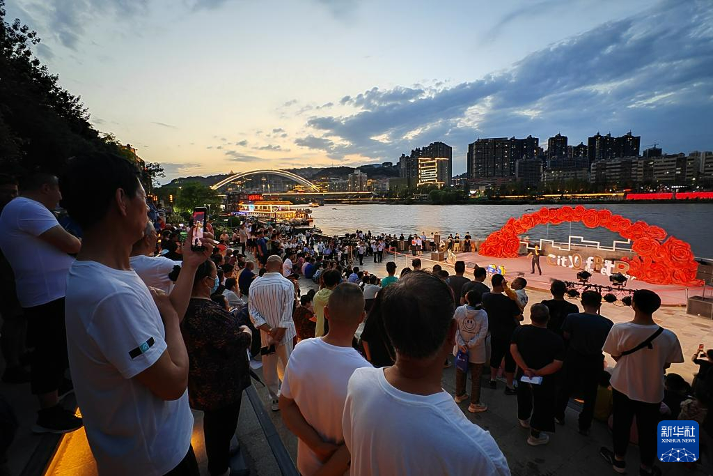 7月19日,在蘭州市城關(guān)區(qū),游客在黃河岸邊欣賞黃河之濱百日千場(chǎng)音樂展演活動(dòng)。新華社記者 范培珅 攝