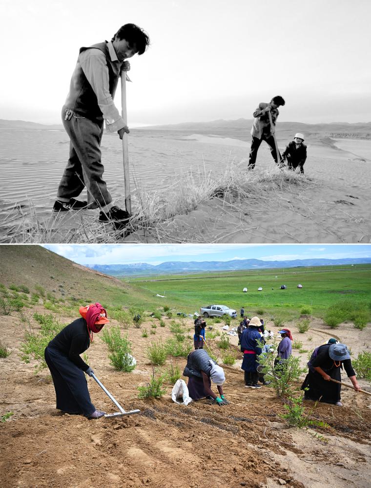 拼版照片:上圖為2002年參與防治沙漠化的工作人員在瑪曲縣黃河沿岸一處沙化草場上壓沙(新華社記者 韓傳號 攝);下圖為2023年7月6日,牧民在瑪曲縣黃河沿岸一處沙化草原治理點進(jìn)行草籽補種工作(新華社記者 張可任 攝)。