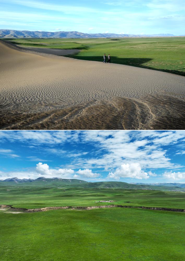拼版照片:上圖為2011年6月9日,兩名技術(shù)人員在甘南藏族自治州瑪曲縣歐拉鄉(xiāng)歐強(qiáng)村查看草場沙化退化情況,這里已經(jīng)成為當(dāng)時瑪曲草原沙化最為嚴(yán)重的草場之一(新華社記者 聶建江 攝);下圖為2023年7月6日在甘南藏族自治州瑪曲縣歐拉鎮(zhèn)歐強(qiáng)村境內(nèi)拍攝的經(jīng)過治理修復(fù)的草原(新華社記者 陳斌 攝)。