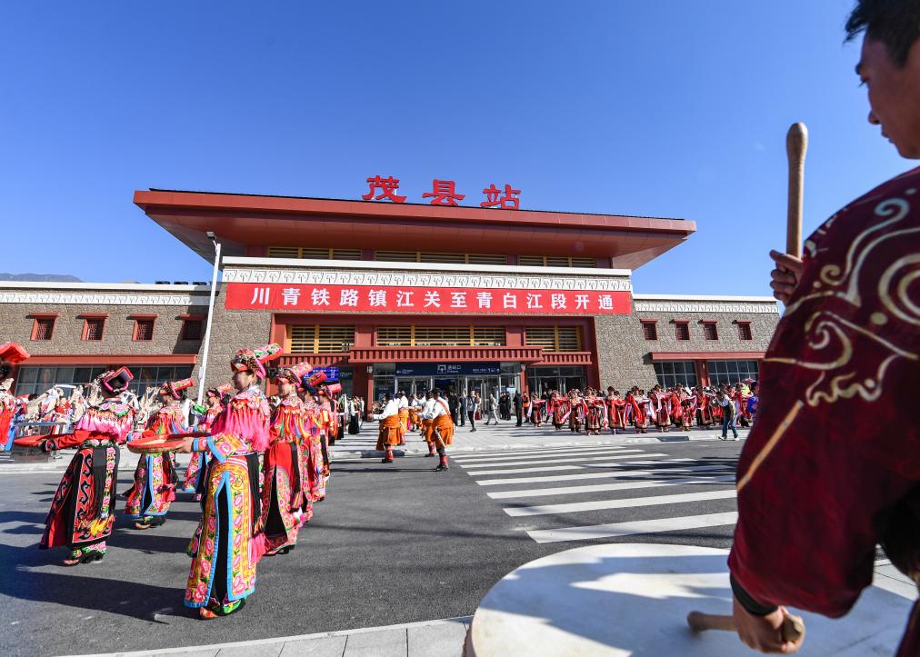 11月28日,在川青鐵路茂縣站,當(dāng)?shù)馗髯迦罕娫谡厩皬V場(chǎng)慶祝鐵路開(kāi)通運(yùn)營(yíng)。 新華社記者 王曦 攝