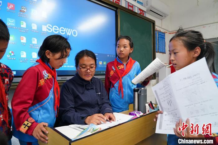 2023年6月20日,德欽縣第一小學(xué)的老師為學(xué)生輔導(dǎo)作業(yè)。中新社記者 劉冉陽 攝