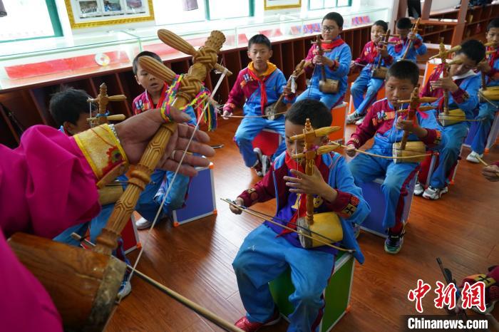 2023年6月21日,德欽縣第一小學(xué)的學(xué)生們?cè)诰毩?xí)藏族傳統(tǒng)樂器弦子。中新社記者 劉冉陽 攝