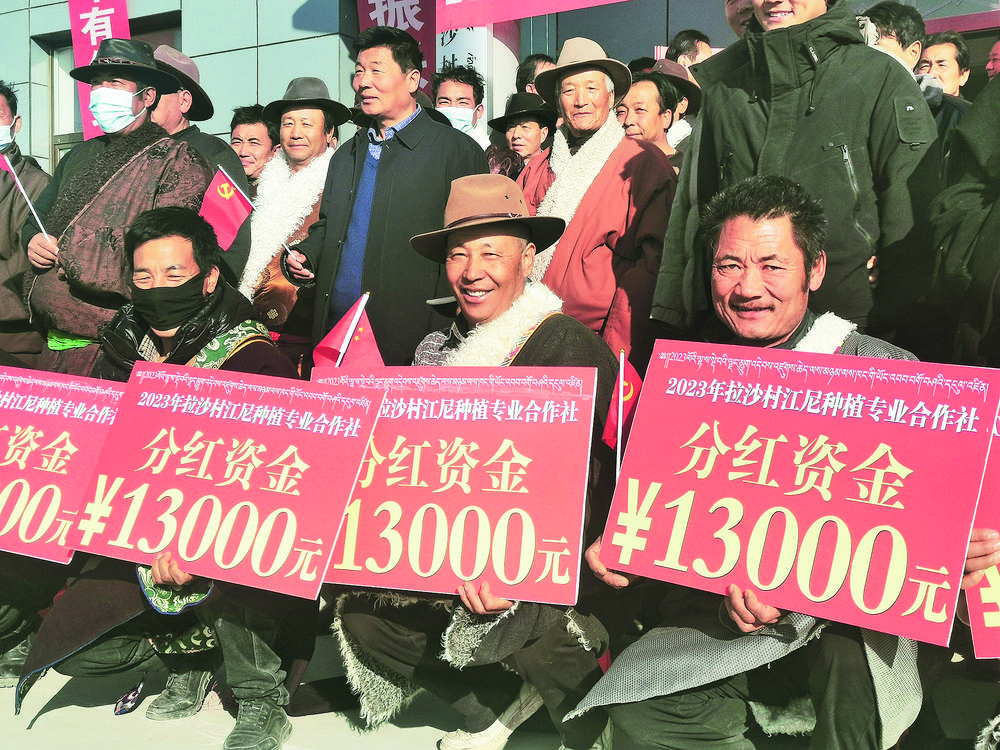 這是拉沙村江尼種植專業(yè)合作社的第三次分紅,也是分紅金額最大的一次。與村民一起將煙花爆竹放置在院落四周,村黨支部書記旦增尖措臉上寫滿了喜悅:“今天我們村又迎來了集體產(chǎn)業(yè)分紅,這次分紅84.5萬元,社員平均1.3萬元,大家切切實(shí)實(shí)享受了好政策帶來的紅利。”