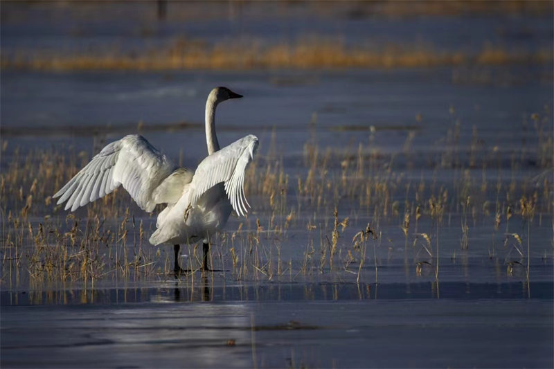 圖為天鵝在冰面上曬太陽(yáng)。巴圖那生 攝