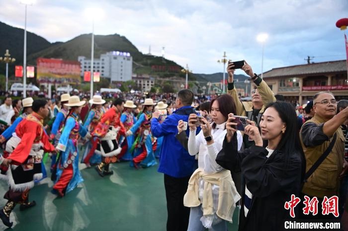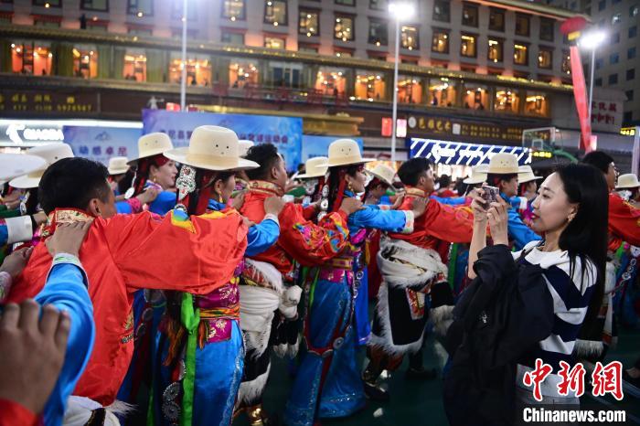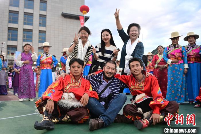 圖為華媒代表與當(dāng)?shù)匚枵咭黄鹛伹f舞。中新社記者 九美旦增 攝