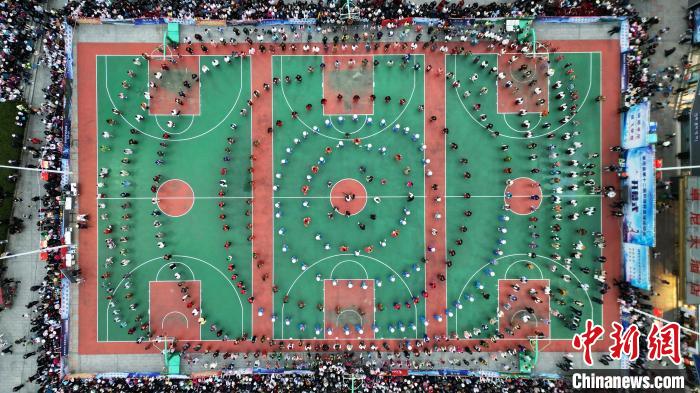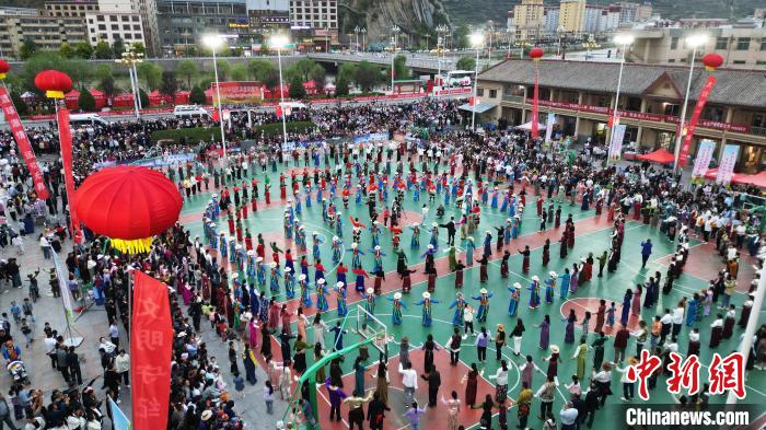圖為“動(dòng)感卓尼”鍋莊舞演出現(xiàn)場(chǎng)。(無(wú)人機(jī)照片)中新社記者 九美旦增 攝