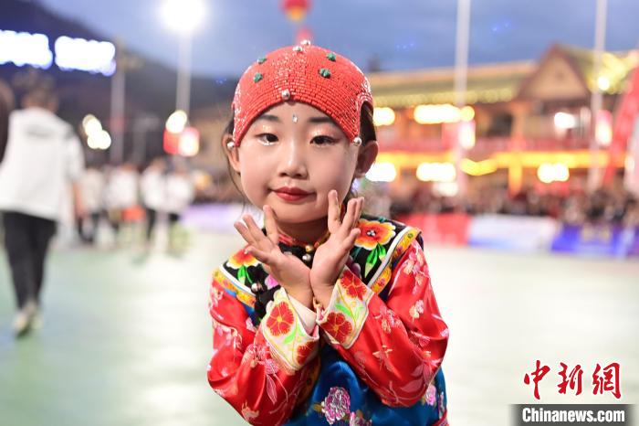 圖為身穿“三格毛”服飾的小朋友參與鍋莊舞表演。中新社記者 九美旦增 攝
