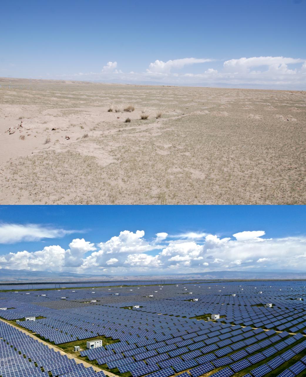如今,荒蕪之地發(fā)展起“風(fēng)光”產(chǎn)業(yè),一改過(guò)去貧瘠荒涼的模樣。站在塔拉灘的瞭望塔上放眼望去,一望無(wú)際的光伏板向陽(yáng)而立,汲取著太陽(yáng)光,源源不斷釋放出綠色能源。