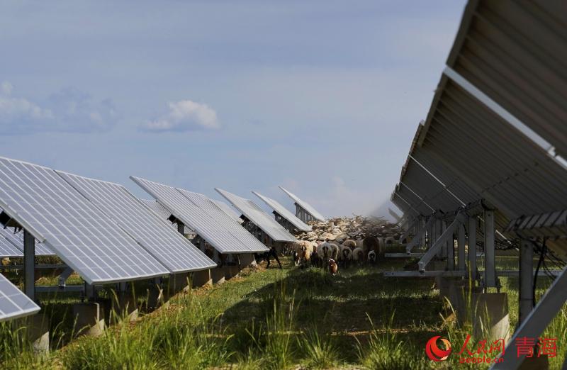 光伏園區(qū)內(nèi)活動(dòng)的羊群。人民網(wǎng)記者 甘海瓊 攝