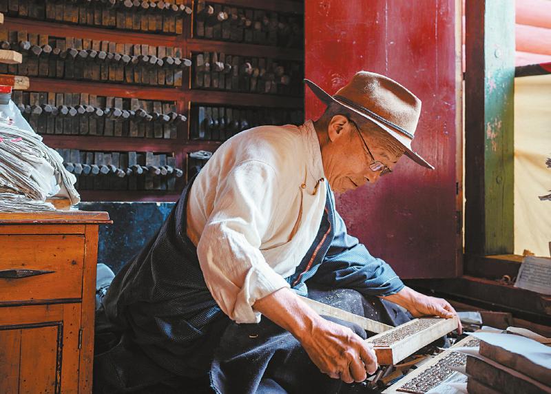 8月28日,甘孜州德格縣德格印經(jīng)院,69歲的彭措澤仁在校對(duì)修復(fù)雕版。作為德格印經(jīng)院藏族雕版印刷技藝的代表性傳承人,他已從事這項(xiàng)工作40余年。何海洋 攝