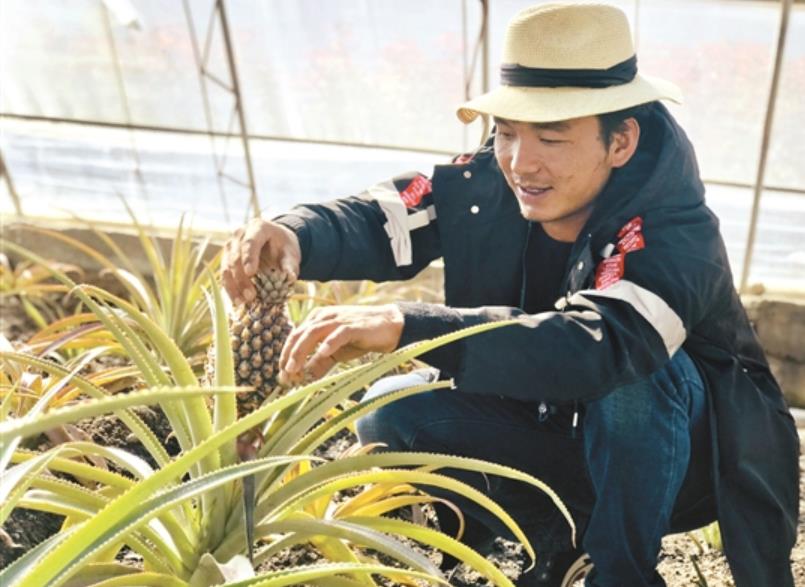 近年來,西藏拉薩曲水凈土健康產(chǎn)業(yè)園加大科技投入,積極引進(jìn)新產(chǎn)品試驗(yàn)試種,調(diào)整種植結(jié)構(gòu),拓寬群眾增收渠道。圖為工作人員展示園區(qū)新試種的菠蘿。記者 凃瓊攝