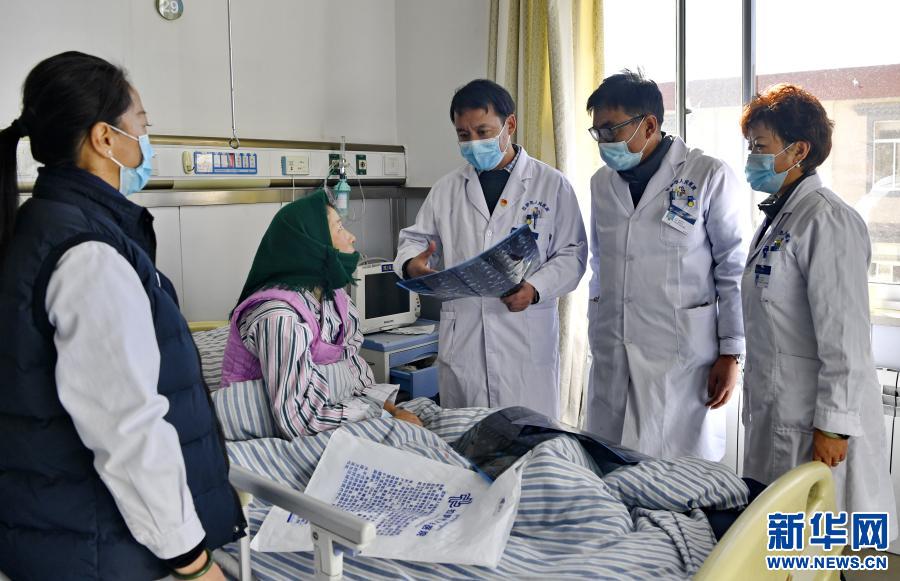 在拉薩市人民醫(yī)院病房,拉薩市人民醫(yī)院副院長(zhǎng)妮瑪(左一)和主治醫(yī)師扎西云旦(中)、外科主任平措(右二)、醫(yī)務(wù)部主任德央(右一)做術(shù)前討論(2020年12月31日攝)。新華社記者 張汝鋒 攝