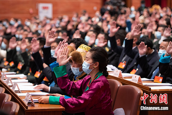 1月24日,西藏自治區(qū)第十一屆人民代表大會(huì)第四次會(huì)議上代表們舉手表決《西藏自治區(qū)國家生態(tài)文明高地建設(shè)條例(草案)》。中新社記者 何蓬磊 攝