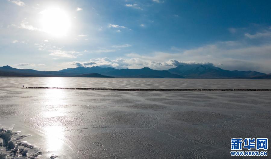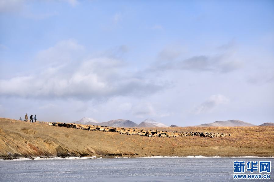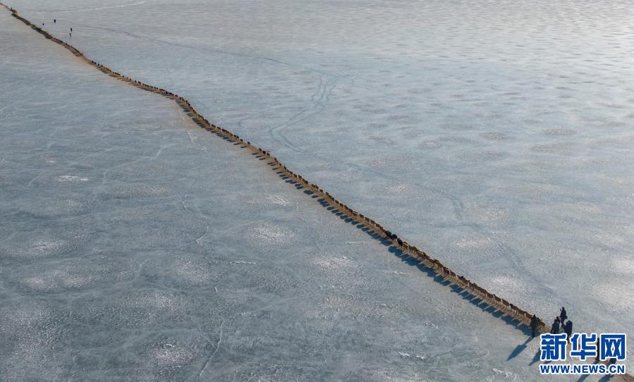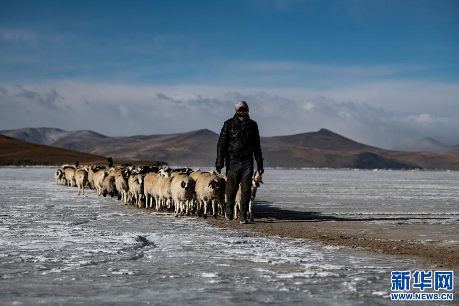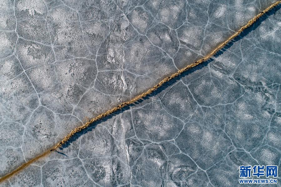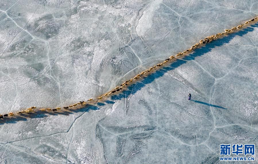 牧羊人趕著羊群,太陽趕著牧羊人。不停向前的羊群在冰湖上拉出長長的隊形。