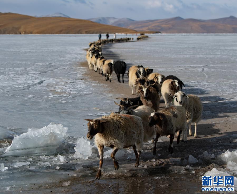 羊群順著安全小路通過普莫雍錯冰湖(3月6日攝)。新華社記者 孫瑞博 攝