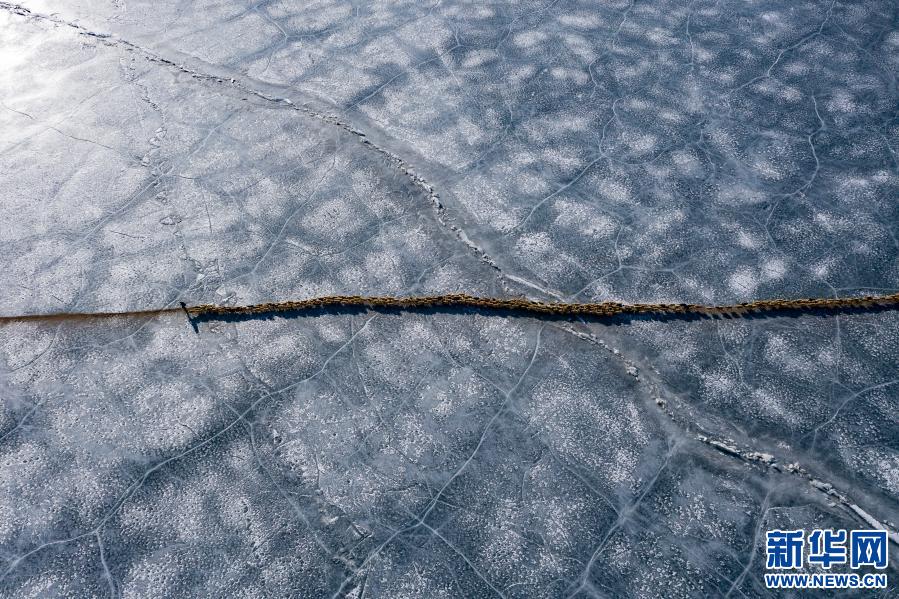 2000多只羊,在冰湖上如一條長長的線,緩緩前行……