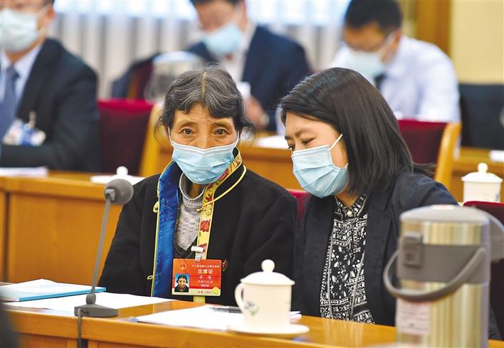 圖為為協(xié)助基層全國(guó)人大代表更全面地了解會(huì)議內(nèi)容,十三屆全國(guó)人大四次會(huì)議西藏代表團(tuán)專門配備了翻譯人員。圖為西藏全國(guó)人大代表卓嘎通過(guò)翻譯人員了解其他代表的發(fā)言內(nèi)容。旦增西旦 攝