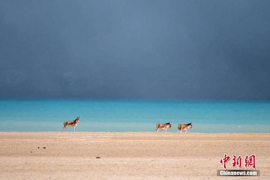 5月2日,三頭藏野驢在西藏第一大湖色林錯湖邊覓食。