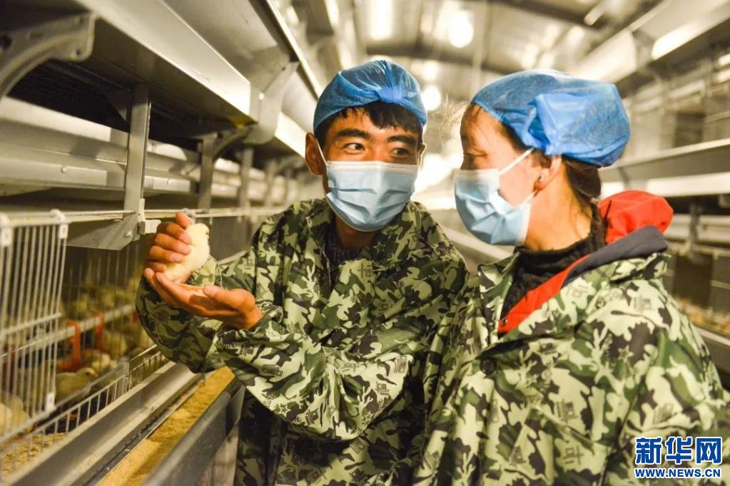 養(yǎng)殖員正在檢查雞苗。(新華社發(fā))