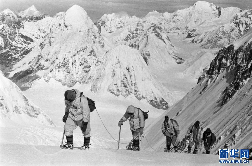 照片拍攝于1960年5月,中國登山隊隊員在海拔7150米的冰雪坡上行進(jìn)。新華社發(fā)