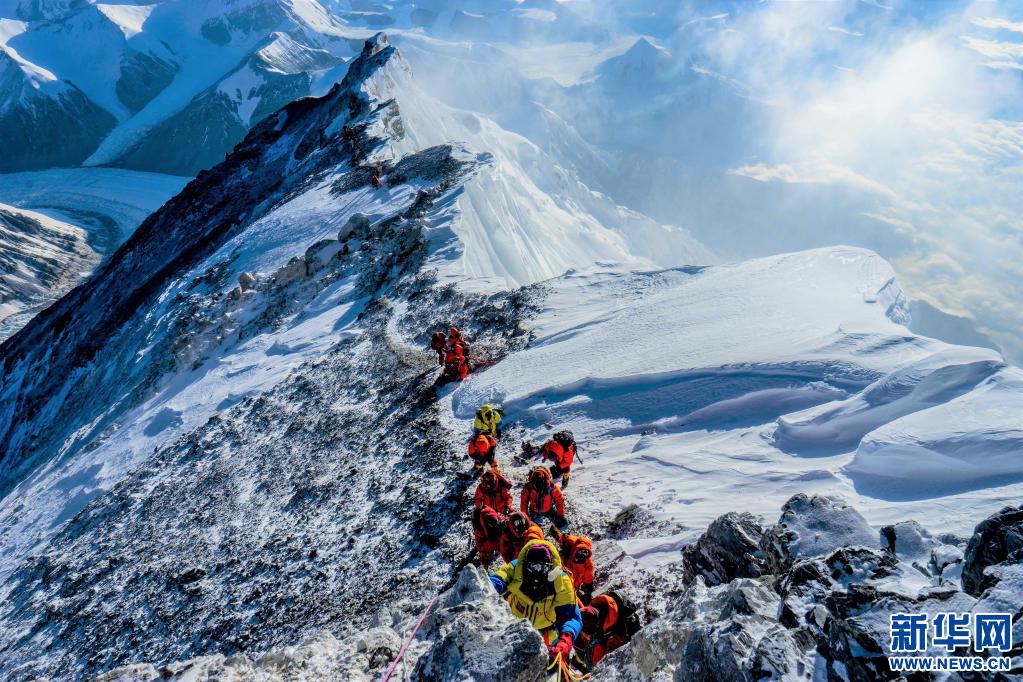 2020年5月27日,2020珠峰高程測量登山隊在峰頂合影留念。新華社特約記者扎西次仁攝